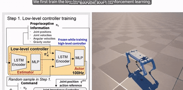 首先,他们通过强化学习来单独训练低级控制器。低级控制器从速度指令和本体感受信息中预测关节的目标位置。而后目标位置再被喂给阻抗控制器转化成扭矩指令。这样低级控制器就可以遵循特定的速度指令。