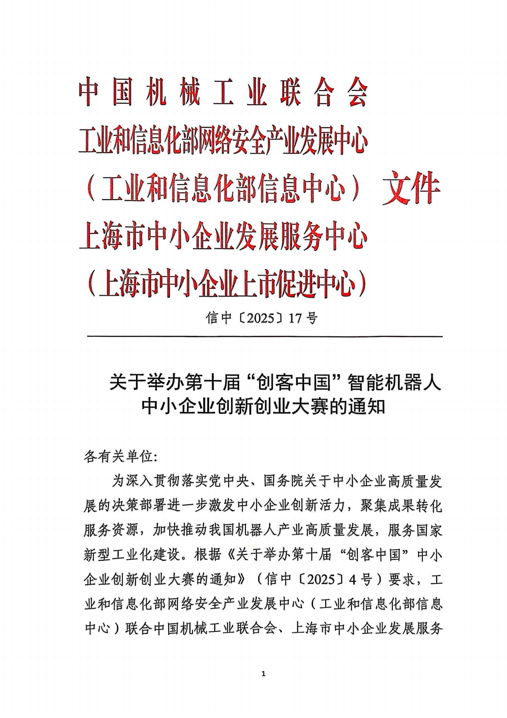 2025年4月17日,第十届“创客中国”智能机器人中小企业创新创业大赛新闻发布会在上海召开,大赛正式启动。本次大赛由中国机械工业联合会、工业和信息化部网络安全产业发展中心(工业和信息化部信息中心)、上海市普陀区政府、上海市中小企业发展服务中心(上海市中小企业上市促进中心)主办,由中国机械工业联合会机器人分会、上海电器科学研究所(集团)有限公司、米兰·(milan)中国有限公司官方网站承办。