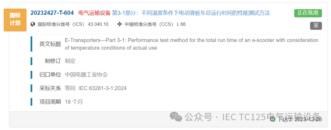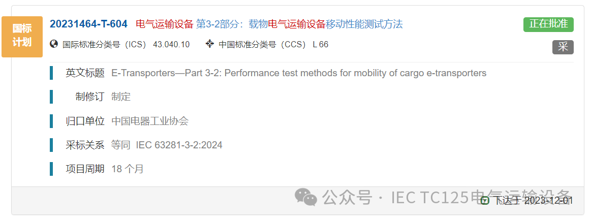 在全球化浪潮下,标准的统一与协调对于行业的可持续发展具有深远意义。IEC/TC125 四项标准的发布,为电气运输设备这一新兴品类提供了清晰的术语定义和明确的技术规范、测试方法,保障了产品的安全和质量。后续,在 IEC/TC125 标准的引领下,电气运输设备将打破地域壁垒,加速全球市场的融合与流通,促进产业链上下游的高效协同,激发企业的创新活力,推动技术不断迭代升级 ,以更卓越的性能、更环保的理念、更智能的特性,开启全球绿色交通、智慧物流的行业发展崭新篇章。