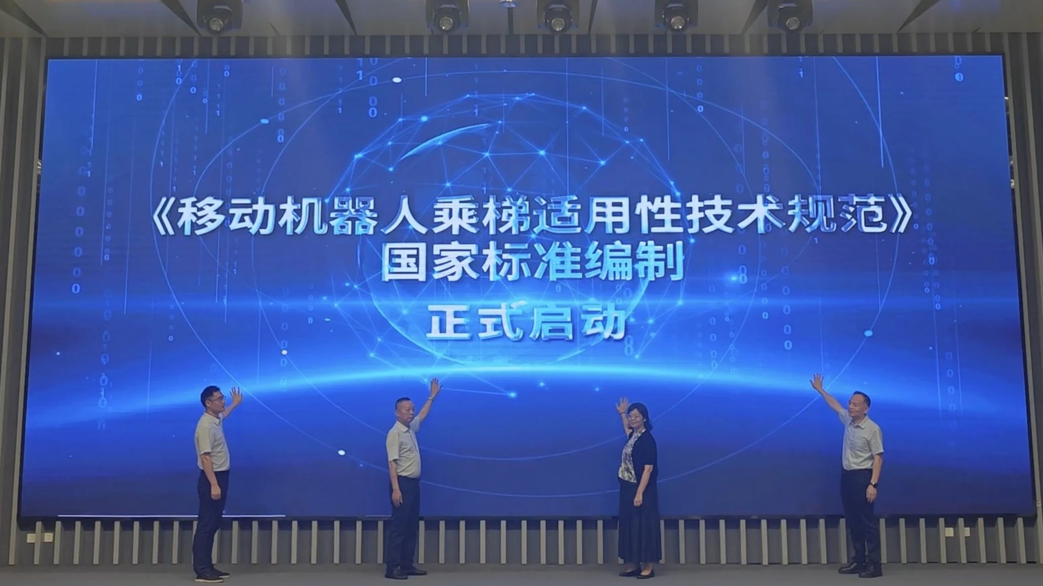 会上,由李菁处长、王会方院长、黄平总经理、郑军奇院长共同启动《移动机器人乘梯适用性技术规范》国家标准编制工作。