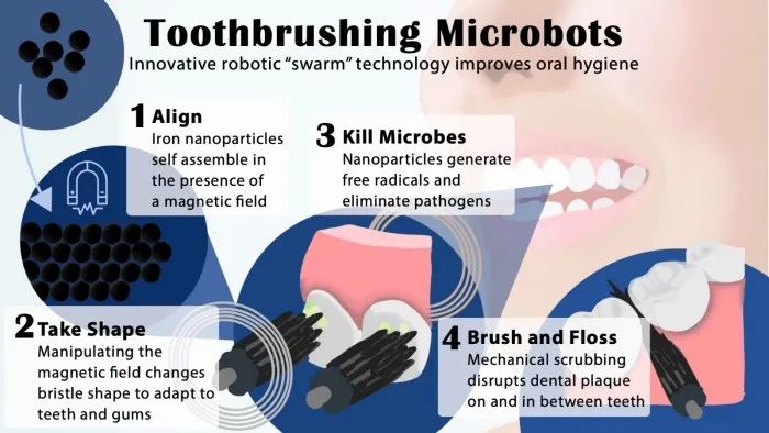 这些微型机器人的构件是具有催化和磁力活性的氧化铁纳米颗粒。利用磁场,研究人员可以指导它们的运动和配置,以形成刷毛般的结构,扫除牙齿表面的牙菌斑,或者形成细长的线,可以像一段牙线一样在牙齿之间滑动。在这两种情况下,一种催化反应驱动纳米颗粒产生抗菌剂,现场杀死有害的口腔细菌。