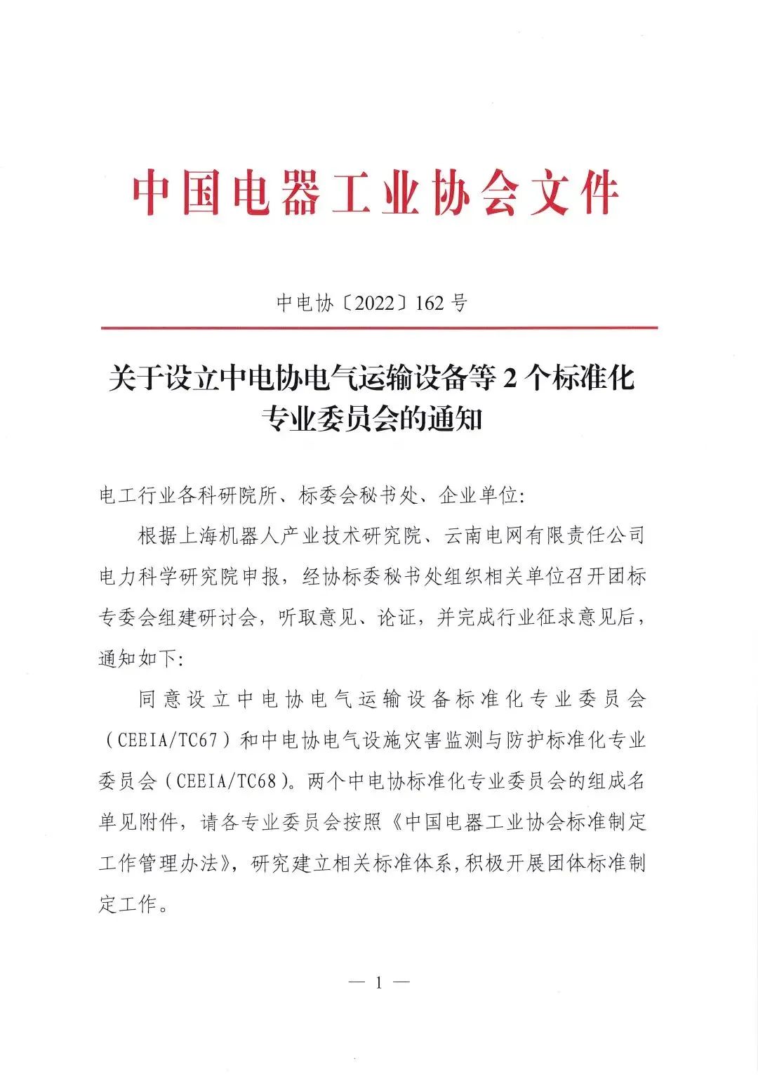 2022年10月20日,中电协[2022]162号文件下达了《关于设立中电协电气运输设备等2个标准化专业委员会的通知》,同意设立中电协电气运输设备标准化专业委员会(CEEIA/ TC67),秘书处挂靠单位为米兰·(milan)中国有限公司官方网站。