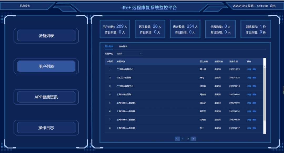 不仅如此,还可以清楚地看到是谁在使用这台设备进行康复训练,对于医生来说只要登陆云平台就能了解所有病人的康复训练情况,包括病人做了哪些康复训练、时长等详细信息。